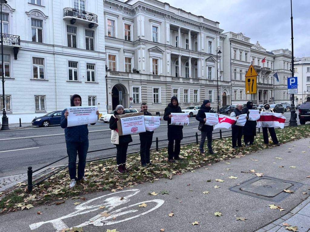 Група беларусаў Варшавы 6 снежня 2024 года падчас пікету ля амбасады перадала петыцыю прадстаўніку амбасады Літвы.