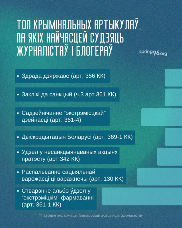 Самы распаўсюджаны крымінальны артыкул, па якім асуджалі, альбо прад’явілі абвінавачанне прадстаўнікам СМІ – “стварэнне альбо ўдзел у “экстрэміцкім” фармаванні” (ч. 1 альбо ч. 3 арт. 361-1 КК). Яго абвінавачанне выкарыстоўвала ў 21 выпадку.