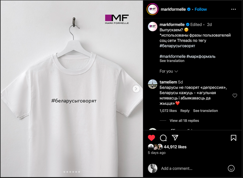 Усю гэтую хвалю абразаў і пагрозаў выклікала тое, што кампанія «Mark Formelle», вядомая сваімі сымпатыямі да беларушчыны, у расейскамоўным гэштэгу, прапанаваным для друку на кашульках, была напісала «беларусы» не праз «о», а праз «а». Здавалася б, краіна называецца Беларусь, адпаведна яе жыхары — беларусы. Хоць ты па-беларуску пішы, хоць па-расейску — аднолькава: Беларусь і беларусы. А вось белорусы — гэта, хутчэй, жыхары Белоруссии.