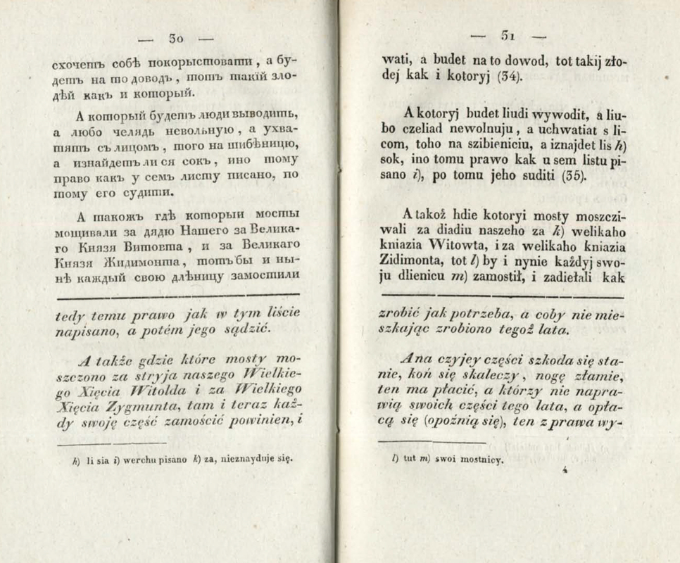 А також, где которыи мосты мощивали за дядю нашого, за великого князя Витовта, и за великого князя Жикгимонта, тут бы и ныне каждый свои мостьници замостили и заделали, как надобе; а штобы не мешкали, сего ж лета уделали. А на чией делници шькода ся станеть, конь ся образить, ногу зломить: тому платити. А пакли которыи не заделають своих делниць сего лета, а исполошаться: тот ис права выступил, на том нам вины десять рублев.