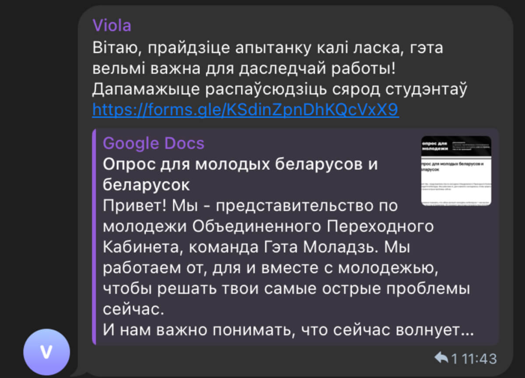 У чатах беларусаў замежжа з’явіліся допісы пра тое, што праводзіцца нейкае апытанне, «важнае для даследчай работы». Арганізатары хочуць, каб анкету запоўнілі студэнты. Паведамленні з просьбай прайсці апытанне распаўсюджвае акаўнт, які мае ID 6288192255 і імя карыстальніка @linga017. Апытанне мімікрыруе пад апытанне, якое цяпер праводзіць Аб’яднаны пераходны кабінет, але ў ім зусім іншыя пытанні.