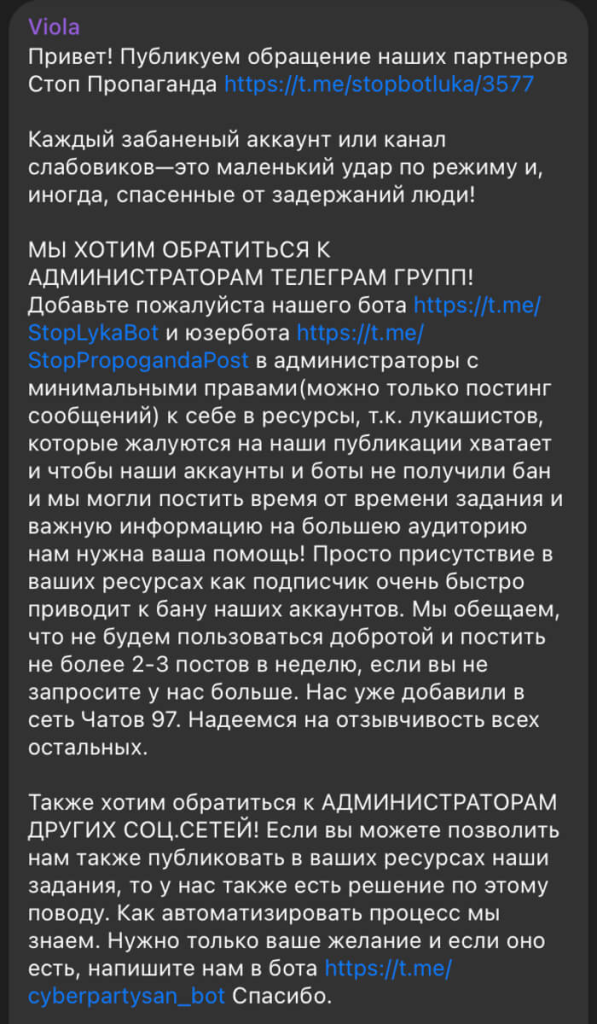 Верагодна, за атакай стаяць спецслужбы Беларусі. Гэты ж акаўнт ужо быў заўважаны ў фэйкавай рассылцы два гады таму. Тады адміністратарам прапанавалі дадаць фэйкавага бота праекта «Стоп Прапаганда» ў свае суполкі. У якасці кантактнага ўказаны фэйкавы бот Кіберпартызанаў.