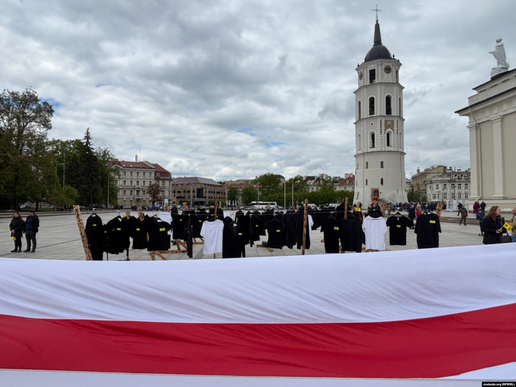 У іншай інсталяцыі сярод дзясяткаў чорных кашуль, якія сымбалізавалі 1200 цяперашніх палітвязьняў, было 7 белых кашуль.