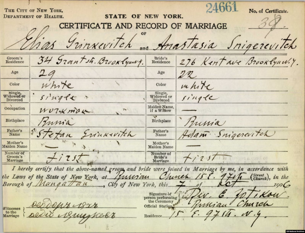 7 кастрычніка 1906 году Эліяс Грынкевіч ажаніўся з 22-гадовай Анастасіяй Сьнігірэвіч (Anastasia Snigerevitch, 1884–1945) — ураджэнкай Вільні, дачкой Адама Сьнігірэвіча, якая апынулася ў Нью-Ёрку ў 1901 годзе. Паводле пасьведчаньня аб шлюбе, цырымонія адбылася ў Мікалаеўскім саборы на Мангэтане — галоўным храме Расейскай праваслаўнай царквы ў ЗША. У дакумэнце прафэсія Грынкевіча пазначана як «рабочы». Імя бацькі нявесты было Адам, а адным са сьведкаў быў Фёдар Лях. Краіна паходжаньня жаніха і нявесты — «Расея». Згодна з матэрыяламі перапісу 1920 году, сужэнства Грынкевічаў разам з чатырма дзецьмі жылі ў Брукліне, працавалі ў абслузе гатэлю. У анкеце пазначана, што родная мова абаіх — «расейская».