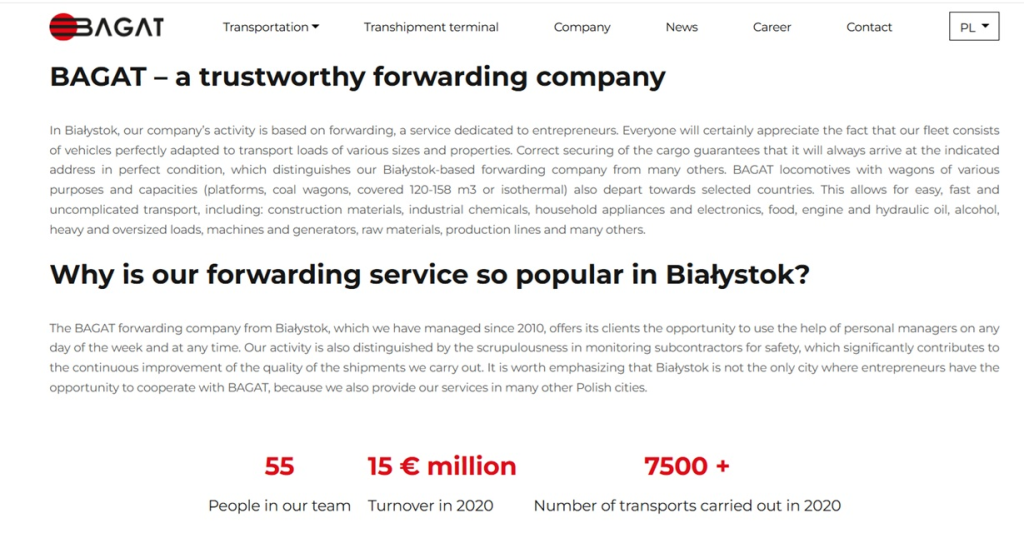 Пятае месца заняла лагістычная кампанія BAGAT, якая працуе ў Беластоку з 2010 года. Заснавальнікі — Яўген Бохан і Яўген Тураў, якім належыць і другая кампанія ў гэтай жа галіне — BGT.