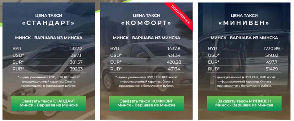 Цана на прыватны трансфер з Мінска, Брэста ці Гродна да Варшавы і іншых польскіх гарадоў будзе залежыць ад адлегласці да патрэбнага месца.