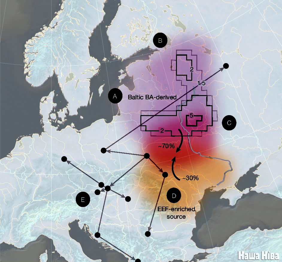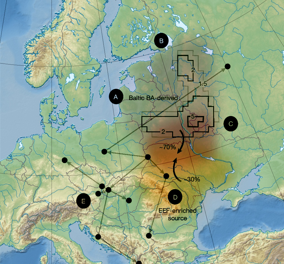 Гэтая «паўночна-ўсходняя» генетычная спадчына стала дамінуючай. Напрыклад, на паўночна-заходніх Балканы (Харватыя) замена склала прыкладна 82%, ва Усходняй Германіі прыкладна 83%, у Польшчы і паўночна-заходняй Украіне — каля 93%, у даліне Волгі і Акі (Расія) замена была меншай, але ўсё роўна значнай — каля 65%.