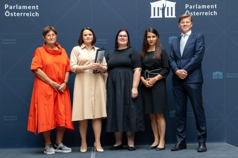 Прадстаўнікі чатырох партый аўстрыйскага парламента – Пэтра Баір (SPÖ), Каріна Райтер (ÖVP), Вайт Дэнглер (NEOS) і Мэры Дзісоскі (Зялёныя) – падпісалі супольную заяву падчас сустрэчы са Святланай Ціханоўскай у межах яе візіту ў Вену.