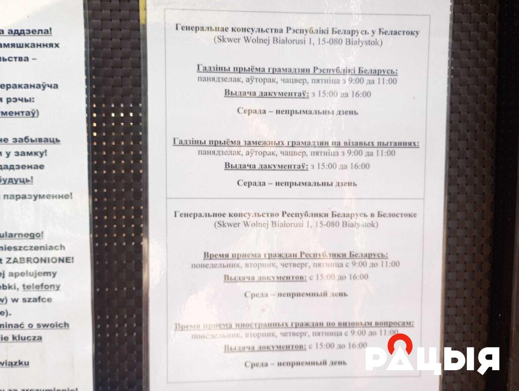 На дзвярах Консульства вісіць абвестка з памылкай: “серада – непрымальны дзень”. Веданне мовы лукашэнкаўскімі чыноўнікамі як заўсёды не на вышыні.
