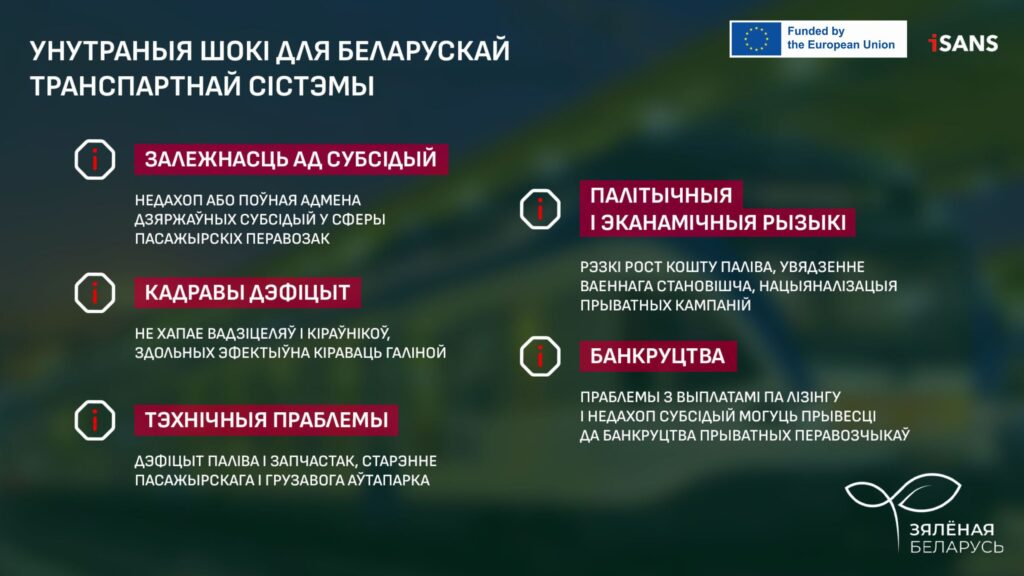 - Тэхнічныя праблемы: дэфіцыт паліва і запчастак, старэнне пасажырскага і грузавога аўтапарка.