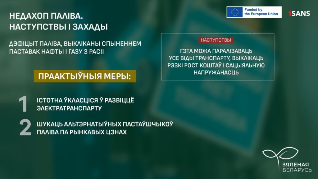 Недахоп паліва. Адным з самых сур’ёзных унутраных шокаў можа стаць дэфіцыт паліва, выкліканы спыненнем паставак нафты і газу з Расіі. Гэта можа паралізаваць усе віды транспарту, выклікаць рэзкі рост коштаў і сацыяльную напружанасць.