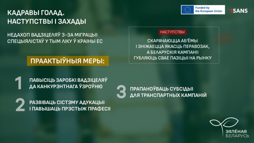 Кадравы голад. Праблема недахопу вадзіцеляў узмацняецца з-за міграцыі спецыялістаў у краіны ЕС, дзе ім прапануюць лепшыя ўмовы і высокія заробкі. У выніку скарачаюцца аб’ёмы і зніжаецца якасць перавозак, а беларускія кампаніі губляюць свае пазіцыі на рынку.