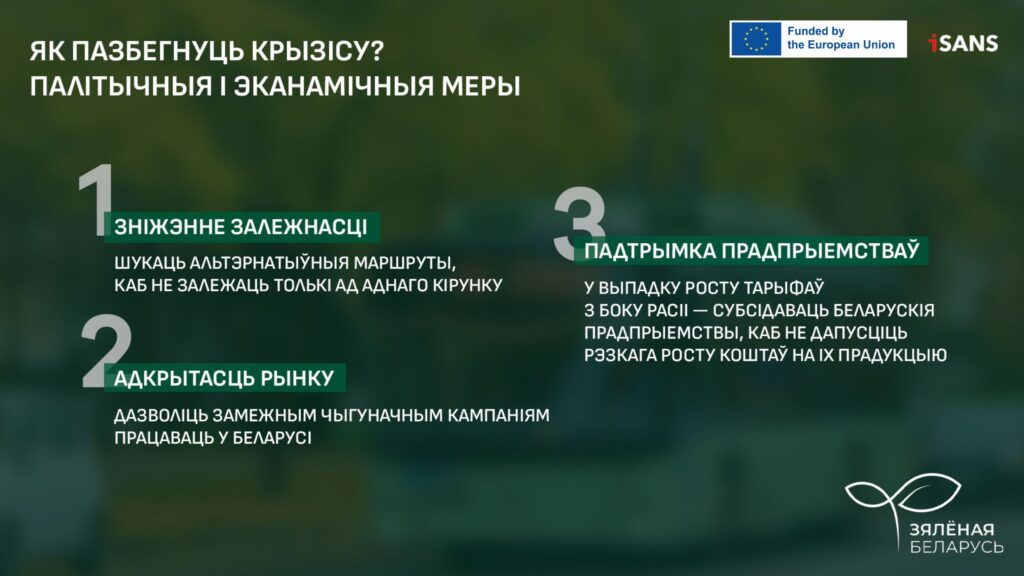 Зніжэнне залежнасці: шукаць альтэрнатыўныя маршруты, каб не залежаць толькі ад аднаго кірунку. Напрыклад, абнавіць дамоўленасці з суседзямі аб тарыфах на перавозкі.
