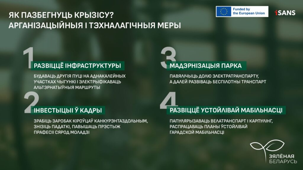 Мадэрнізацыя парка: павялічыць долю электратранспарту ў пасажырскіх і грузавых перавозках, а таксама развіваць беспілотны транспарт у доўгатэрміновай перспектыве.