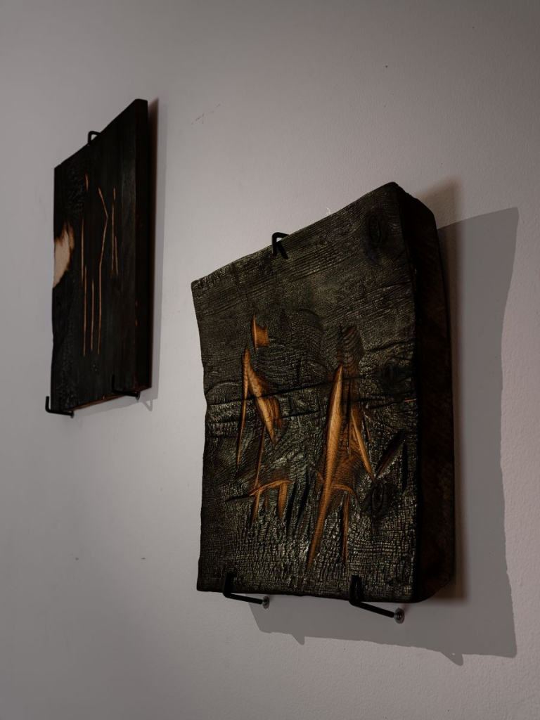Польскі мастак Рафал Буйноўскі свае працы «Пажар» і «Сяляне» выканаў у тэхніцы піраграфіі – з дапамогай выпальвання малюнка на дрэве разагрэтым інструментам. Гэты метад дазваляе ствараць выразныя, тэкстураваныя выявы, якія балансуюць на мяжы рэалістычных і абстрактных. Фактура спаленага дрэва стварае адчуванне непакою, які адгукаецца ў відэа Антаніны Слабодчыкавай «Яно тут», дзе пасярод беларускага ландшафту гарыць інсталяцыя са штучных чорных кветак, якая фармуе словы «Яно тут». Цішыня і спакой прыроды падкрэсліваюць стабільнасць і непарушнасць, кантрастуючы з нябачнай пагрозай, якая вагаецца ў паветры.