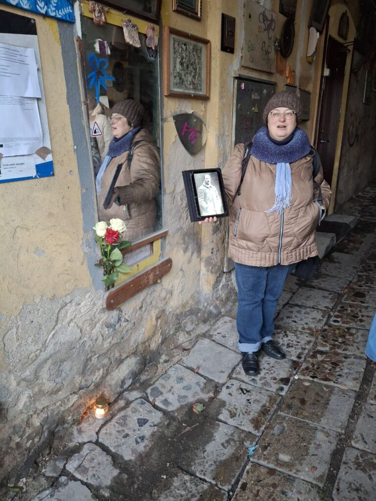 Шпацыр правяла экскурсавод Валерыя Чарнаморцава — стваральніца віртуальнага музея савецкіх рэпрэсій у Беларусі, якая цяпер жыве ў Вільні: