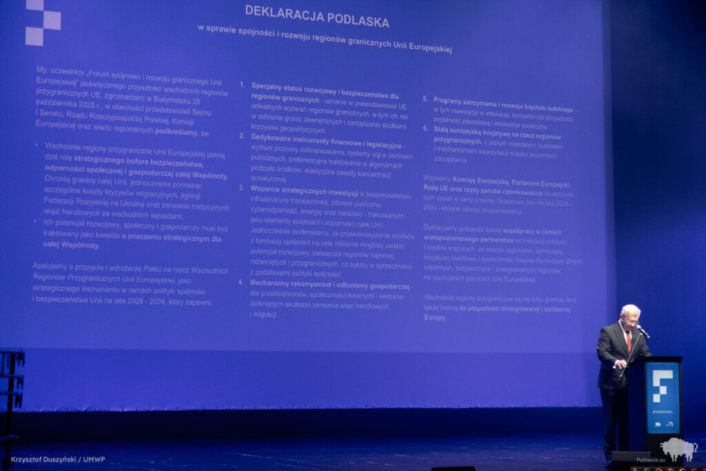 Урачыстым падпісаннем Падляшскай дэкларацыі завяршыўся Форум супольнасці і памежнага развіцця Еўрапейскага Звяза, які прайшоў у Беластоку. Дакумент утрымлівае шэсць асноўных пастулатаў, скіраваных на падтрымку рэгіёнаў, што знаходзяцца ўздоўж знешніх межаў ЕЗ.