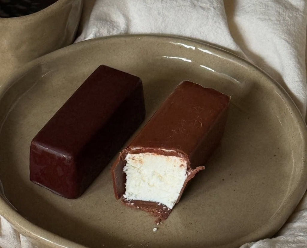«А калі начынка пачынае крыху раставаць, з’яўляецца шмат ягаднага соку. Дадаю толькі зусім трошкі жэлаціну — без крухмалу, каб маса заставалася натуральнай, толькі трохі больш шчыльнай. Але частка соку ўсё адно выдзяляецца. Таму пасля таго, як пакрыем сыркі шакаладам, мы яшчэ акуратна «заштукатурваем» бакавінкі, каб увесь гэты сок заставаўся ўнутры і насычаў сырок», — кажа Эля.
