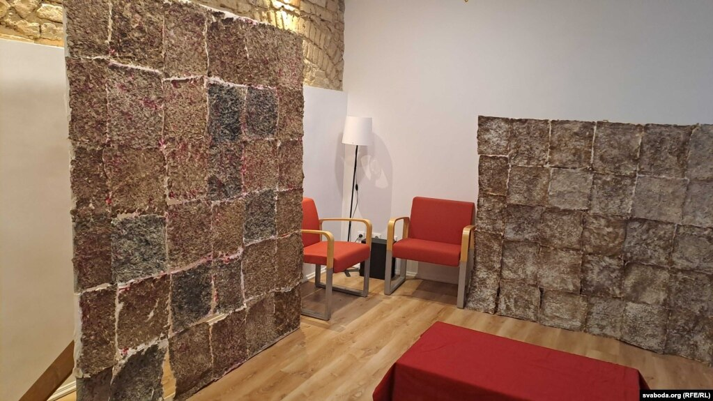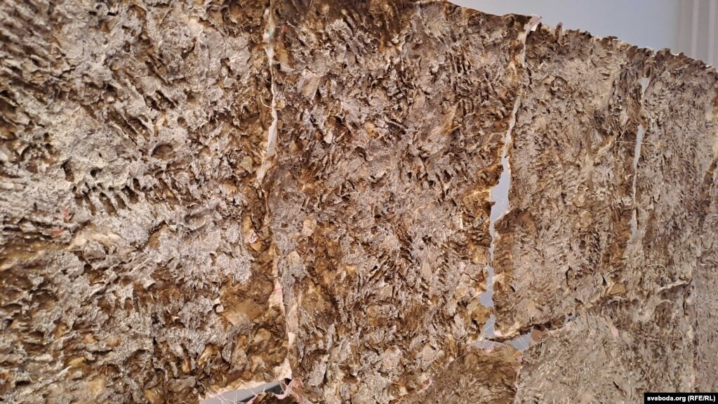 «Гэта перамолатыя ў млынку для кавы кардонныя кантэйнэры для яек. Плюс клей на крухмале, воцат і соль супраць цьвілі, крыху харчовай фарбы для калярыту. Сапраўды атрымалася тэкстура фаршу, які застыў у чаканьні: нібы ўжо не старое становішча, але яшчэ ня новае, невядома што. Як наша эмігранцкае жыцьцё — мы ўсе перамолаты «фарш».