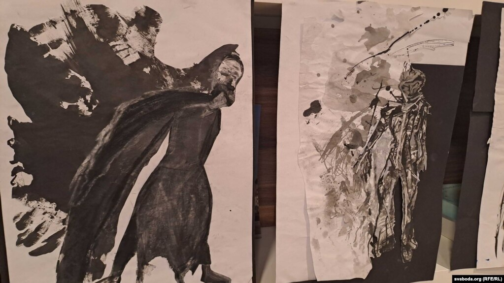 Выставу адкрываюць графічныя рысункі Аліны: знаёмы куток Вільні ў вечаровым марыве, пляма чорнай фарбы з рысамі чалавека ў бегу, партрэт дзяўчыны ў трывожных танах.