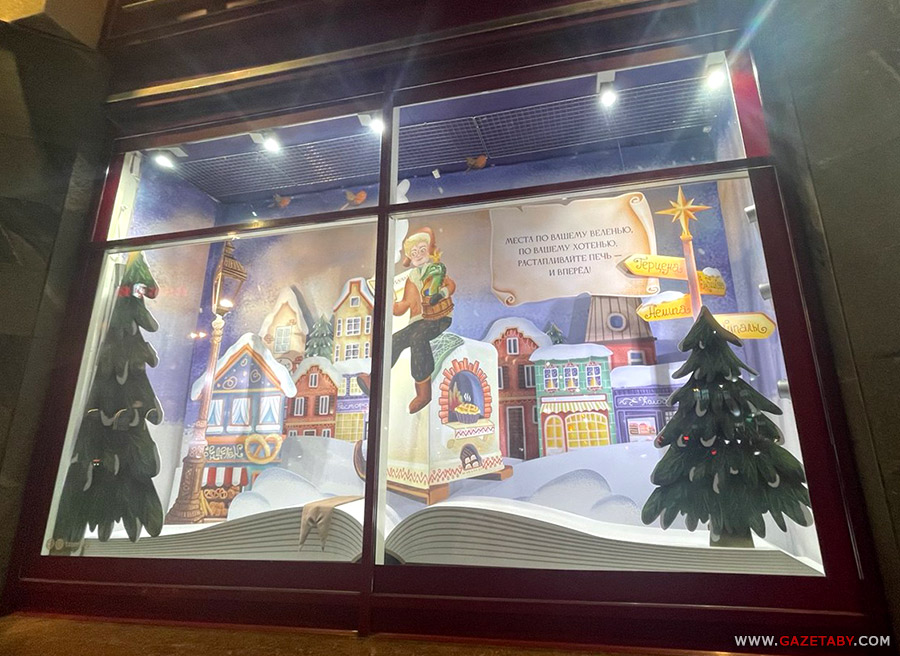 За шклянымі вокнамі ГУМа — рознакаліберныя ёлкі, больш ці менш яркія малюнкі, назвы знаёмых беларусам кампаній. Чотка, ярка, па-беларуску… ні слова. Хоць яшчэ пару год таму — было. У ЦУМе яшчэ горш: падкрэслена рэкламныя адсылкі да рускіх казак: Ямеля, Марозка. Пры чым тут Новы год? Пры чым тут Беларусь?