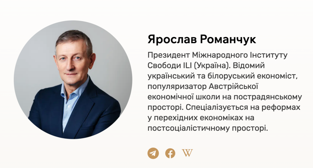 «Я з’яўляюся прэзідэнтам Міжнароднага інстытута свабоды. Гэта мазгавы цэнтр, які стварылі бізнэсмены і інтэлектуалы Украіны, якія арыентуюцца на прасоўванне ідэі, тэорыі і практыкі свабоднага рынку і капіталізму. Груба кажучы, гэта тое, чым я займаўся ў Беларусі апошнія 30 гадоў у рамках навукова-даследчага цэнтра Мізэса. Такога роду мазгавога цэнтра ва Украіне раней не было», — адзначае Раманчук.
