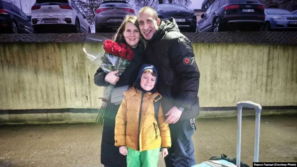 Былы палітзьняволены, палітык Павал Севярынец сустрэўся зь сям’ёй: жонкай і сынам, якія прыехалі да яго ў Вільню. Фота зрабіў Барыс Гарэцкі.