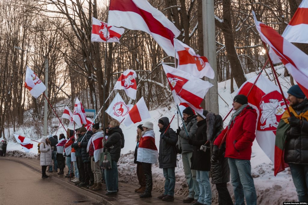 «Тут мы мусім паказаць, што мы ёсьць, што не спынілі барацьбы. А яшчэ я сюды прыйшоў, каб выказаць Зяленскаму і ўсім украінцам нашу беларускую салідарнасьць».