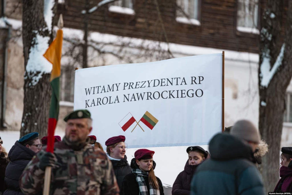 «За нашу і вашу свабоду!», «Слава Ўкраіне!», «Хай жыве Польшча!», «Жыве Беларусь!», «Жыве Літва!» — чую вітаньні ад людзей, што стаяць уздоўж дарогі. Тут таксама лунаюць бел-чырвона-белыя сьцягі.