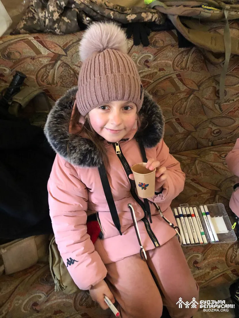 Сястрычкі Улада і Мілана жывуць у суседнім доме і часта заходзяць у намёт. Улада намалявала кветку на папяровым кубачку і расказвае, што прыходзіць сюды амаль кожны дзень, паказвае малюнкі, якія стварылі яе сябры.