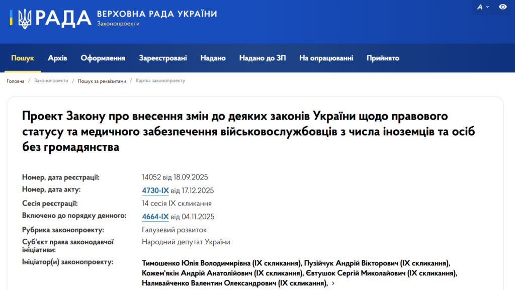 Закон падпісаны Прэзідэнтам Украіны Уладзімірам Зяленскім і ўступіць у сілу праз тры месяцы пасля афіцыйнай публікацыі, што азначае, што ўсе правы і гарантыі для замежных добраахвотнікаў стануць дзейнымі праз гэты тэрмін. Дакумент рэгулюе прававы статус, медыцынскае забеспячэнне і сацыяльныя гарантыі іншаземцаў і асоб без грамадзянства, якія служаць у ЗСУ і іншых вайсковых фармаваннях.