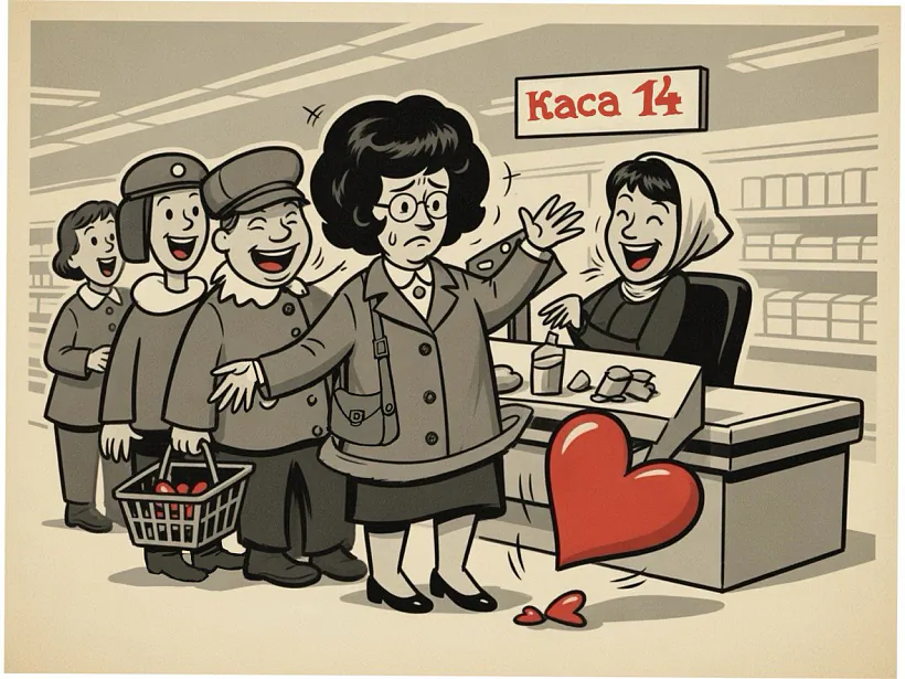 Занураная ў гэтыя думкі, Любоў Аляксандраўна больш-менш ачомалася толькі на касе ў «Кароне». Супакоена яна паглядзела па баках — аніякіх плюшавых мішак, ружовых чакалядак, паветраных шарыкаў з надпісамі «I love you».