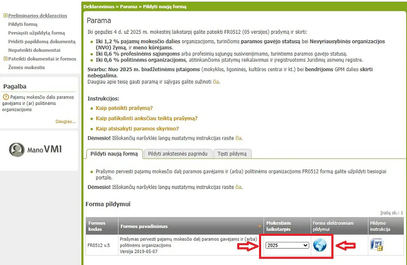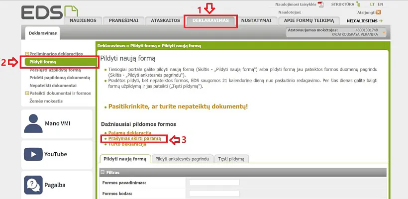 3. Пасля аўтарызацыі ў сістэме абярыце «Pūdyti formą»\«Запоўніць форму» ў раздзеле «Deklaravimas»\«Дэкларацыя». Заяўку на падтрымку вы можаце знайсці ў спісе «Prašymas skirti paramą»\«Запыт на падтрымку».