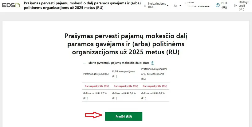 5. Пры націсканні на значок глобуса адкрыецца першае акно майстра падтрымкі. Для пачатку запаўнення націскаеце «Pradėti»\«Старт».