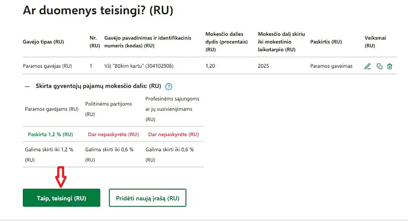 8. У вас павінна атрымацца форма запоўненая так, як на скрыншоце ніжэй. Яшчэ раз праверце правільнасць даных. Калі ўсё правільна — націскайце «Taip, teisingi»/«Так, правільна».
