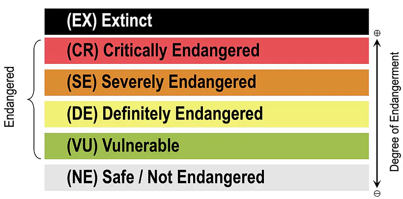 — «Severely endangered» («сур’ёзна пад пагрозай зьнікненьня») — у гэтай мове размаўляюць бабулі і дзядулі і старэйшыя пакаленьні; хоць бацькоўскае пакаленьне можа разумець яе, яны не размаўляюць у ёй зь дзецьмі ці паміж сабой