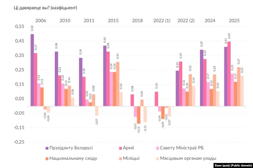 — Фармальна кажучы, сапраўды адбылося вяртаньне ўзроўню даверу дзяржаўным інстытутам, які быў у сярэдзіне нулявых — на пачатку дзясятых гадоў. Але прырода гэтага даверу мяняецца. Давер зараз зьвязаны зь перажываньнем спэцыфічнай сытуацыі калектыўнай траўмы. Рэзкі ўсплёск субʼектнасьці ў 2020 годзе і наступны яе рэзкі спад абумоўлівае ўспрыманьне сытуацыі. Людзі канстатуюць — чысьценька ж на вуліцы, паставіш машыну каля падʼезду, дык не разабʼюць. Чаго табе яшчэ трэба? Дык і памаўчы, ня лезь куды ня трэба.