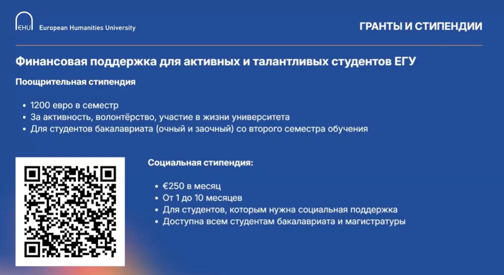 – У першым семестры навучання абітурыенты могуць падавацца толькі на гранты, або на сацыяльную стыпендыю, якая з’яўляецца асобным відам падтрымкі, яна не залежыць ад акадэмічных дасягненняў. Там ёсць асобныя крытэрыі. І на сацыяльную стыпендыю можна падавацца ўжо з першага семестру, калі ў гэтым ёсць неабходнасць.