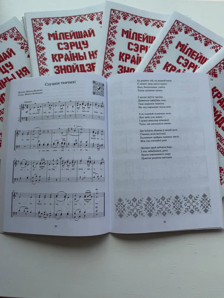 На вокладцы перавыдання — фотакопія вышыўкі, якую зрабіла ўкладальніца. Кожная песня суправаджаецца qr-кодам, па якім на youtube-канале Таццяны Грыневіч-Матафонавай можна паслухаць, як твор гучыць у выкананні хора (усе партыі запісала сама спявачка, а некаторыя песні — з сынам Адасем Матафонавым). «У зборніку — ноты для хору, — тлумачыць укладальніца. — Але і адзін чалавек дома можа слухаць запісы на канале і, гледзячы ў ноты, падпяваць мелодыю».