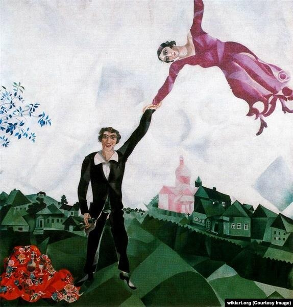 Пазнаёміліся Марк і Бэла ў 1909 годзе ў Віцебску. Яму 22, ёй 19. Ён — бедны мастак, яна — з багатай сям’і. Гэта было каханьне зь першага погляду. Пабраліся маладыя ў 1915-м, падчас Першай усясьветнай вайны. Гэта быў пэрыяд максымальнага шчасьця, які пазьней стане асновай для многіх іншых Шагалавых палотнаў.