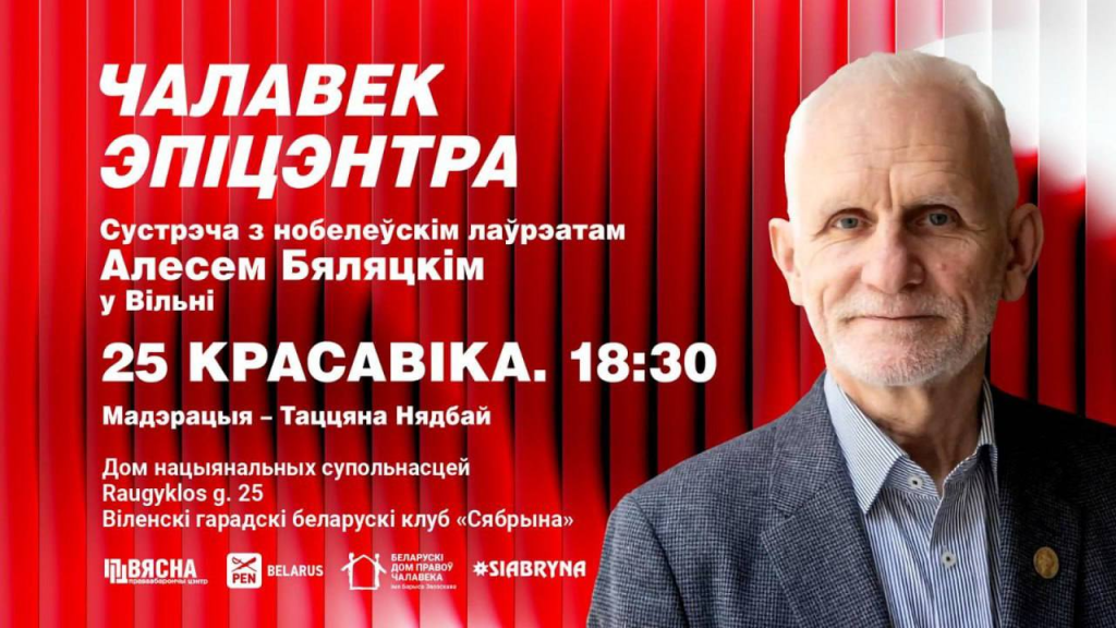 У суботу 25 красавіка а 18:30 запрашаем на сустрэчу з праваабаронцам, кіраўніком «Вясны» і нобелеўскім лаўрэатам Алесем Бяляцкім у сталіцы Літвы.