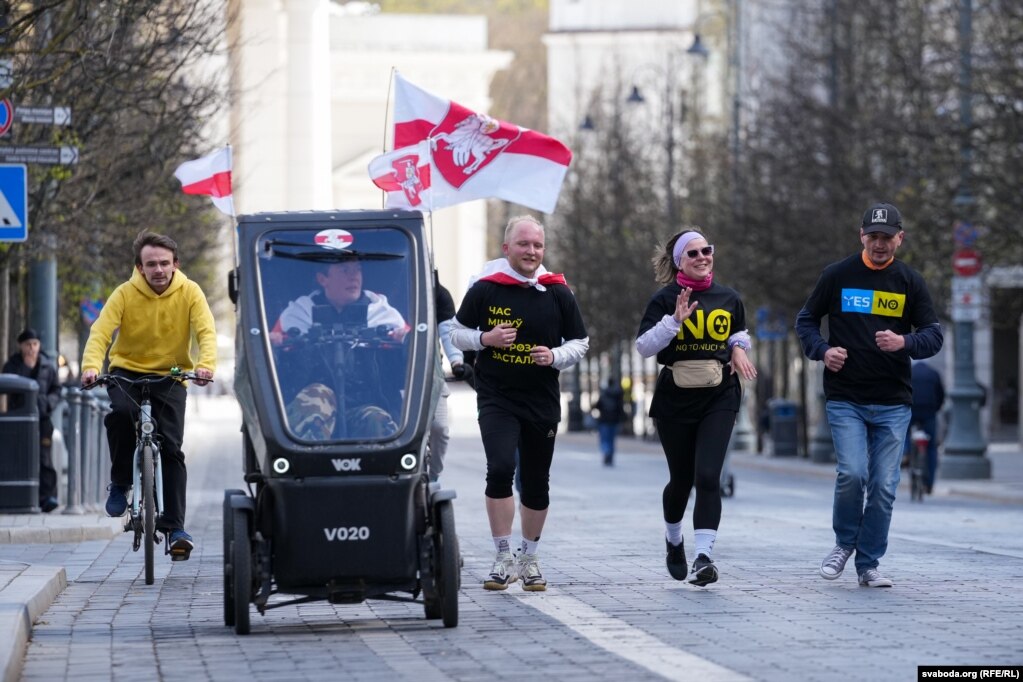 «Прабеглі за 17 хвілін», — расказаў удзельнік прабегу, дарадца офісу Ціханоўскай Дзяніс Кучынскі. На чорнай саколцы, якую надзеў палітык, было напісана «Час мінуў — пагроза засталася».
