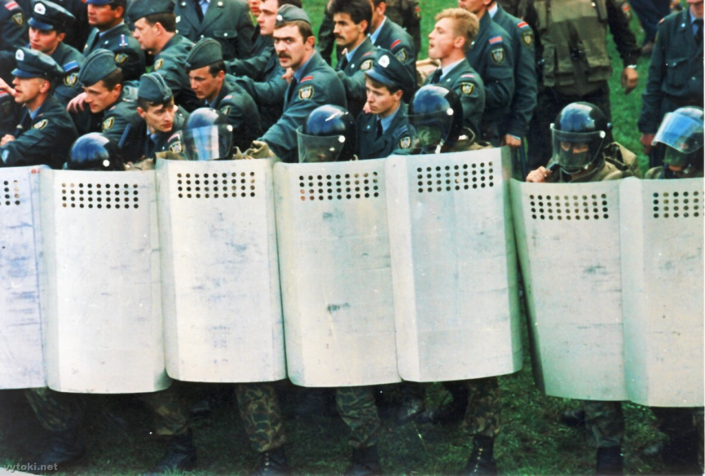Міналі Дом мадэляў. З абодвух бакоў — міліцыянты са шчытамі. У ачапленьні зусім яшчэ маладыя хлапчукі. За імі нэрвова хадзілі афіцэры і, лаючыся, аддавалі загады:
