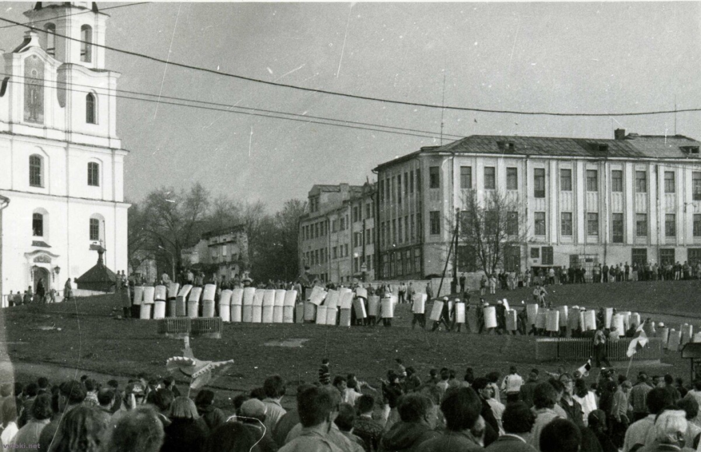 Калі калёна падышла, мы далучыліся амаль у самым пачатку і пайшлі разам з усімі — шчыльнай, жывой ракой. Ад Акадэміі навук да плошчы Якуба Коласа прайшлі на гэтым узьлёце, амаль не адчуваючы стомы. І там упершыню ўбачылі міліцыю. Заслон — ланцуг людзей у форме, са шчытамі і дручкамі. І супраць іх натоўп. Тысячы людзей. Гэты націск было немагчыма спыніць. Міліцыянтаў пачалі цясьніць, літаральна ўціскаць у сьцены дамоў. Яны адступалі, ня ведаючы, што рабіць — па тварах было бачна: не чакалі такое рашучасьці ад грамадзянскіх людзей.