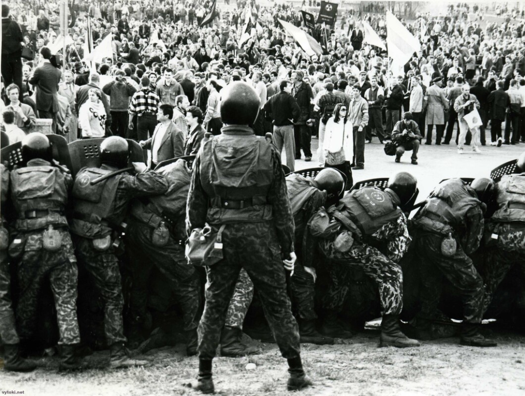 Пакуль яшчэ нікога не чапалі. Падымаліся па прыступках уздоўж будынку праектнага інстытуту. Падняў вочы — і анямеў: наверсе нас чакала такая ж сьцяна шчытоў. Пастку захлопнулі. Мы ўпершыню па-сапраўднаму спужаліся. Людзі вакол таксама спыніліся, разгублена глядзелі адзін на аднаго. Было ясна: зараз нешта будзе. Раптам па чыёмусь загаду сьцяна наверсе разышлася. Людзі інстынктыўна кінуліся наперад — да праспэкту. Там здавалася больш бясьпечна.