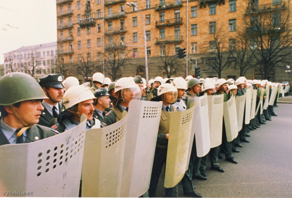 Асноўная калёна фармавалася недзе ля Акадэміі навук. Людзі з Захаду, Паўднёвага Захаду зьбіраліся на Кастрычніцкай плошчы ля палаца Белсаўпрофу, каб потым уз’яднацца на праспэкце Скарыны. Чуваць было размовы, што Пазьняка ў Менску няма і, напэўна, мерапрыемства адбудзецца без яго. Шкада. На мітынгі ішлі, каб паслухаць яго жывую мову. Больш палымянага і натхнёнага прамоўцы я ня ведаў. Падышлі бліжэй да палаца, каб зьверху паглядзець, што робіцца на праспэкце ў бок вуліцы Янкі Купалы. Бачна да будынку цырку і нават да плошчы Перамогі. Матухна родная… Уся прастора галоўнай магістралі ад помніка і да вуліцы Янкі Купалы запоўненая дзясяткамі тысячаў людзей са сьцягамі і транспарантамі. Мора людзкое. І… разбівалася яно аб скалу АМАПу. Адразу за вуліцаю Янкі Купалы праспэкт быў перагароджаны аўтобусамі. Далей — пустая прастора мэтраў трыццаць. І яшчэ далей — у некалькі шарэнгаў шэра-зялёная сьцяна ўнутраных войскаў. Было відавочна: сабраліся не для фармальнасьці. Далей не прапусьцяць.