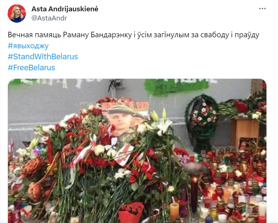 Пасол Літвы ў Беларусі па асобых даручэннях Аста Андрыяускене зрабіла свой твіт на беларускай мове, напісаўшы: «Вечная памяць Раману Бандарэнку і ўсім загінуўшым за свабоду і праўду».