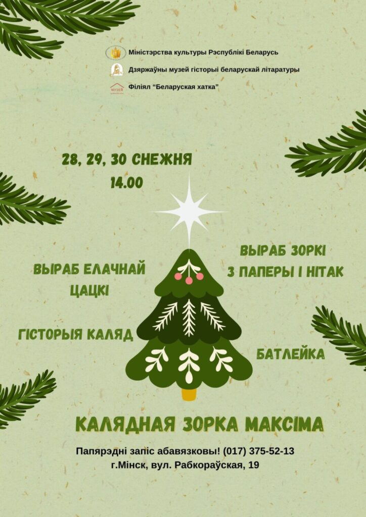 28, 29 і 30 снежня 2023 года а 14-й гадзіне філіял “Беларуская хатка” сардэчна запрашае далучыцца да мерапрыемства, якое пазнаёміць вас з гісторыяй аднаго з самых містычных святаў – Калядаў. Дакранемся да старажытнага віда мастацтва – батлейкі, а таксама паспрабуем зрабіць калядную зорку і елачныя цацкі.